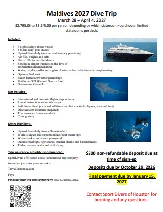 Don’t wait—the Maldives is one of our most requested destinations! This trip is perfectly timed for peak marine life activity. Contact the team at Sport Divers of Houston in Webster to secure your cabin and prepare for the dive trip of a lifetime.